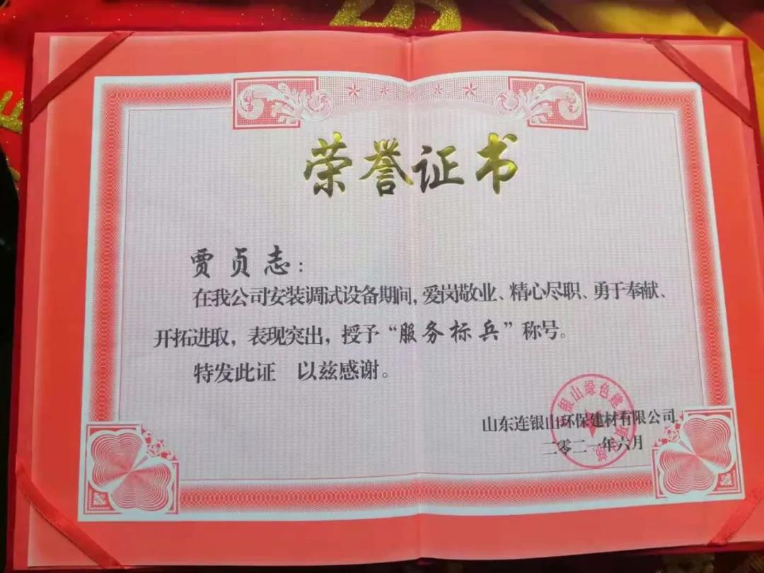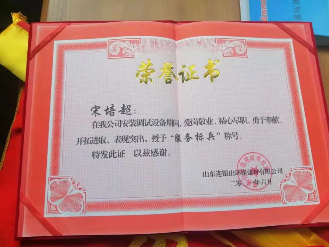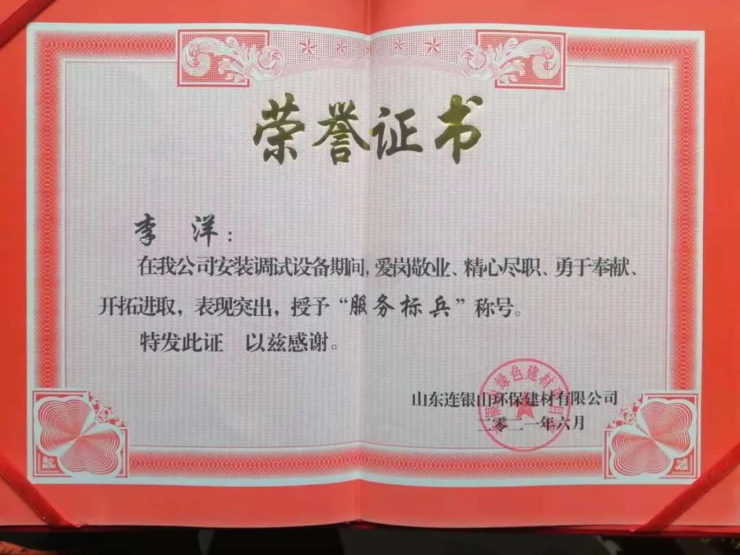 炎炎夏日,天意機械在向客戶山東連銀山環(huán)保建材有限公司售出保溫裝飾一體化板生產(chǎn)線之后,隨即派出售后團隊對設(shè)備進行安裝調(diào)試及售后培訓(xùn)。售后團隊不畏酷暑,精心、耐心、專業(yè)地為客戶進行安裝調(diào)試,贏得了客戶的好評和認可,客戶為表達謝意,特授予天意機械售后人員榮譽證書和錦旗,以表彰售后人員愛崗敬業(yè)、精心盡職、勇于奉獻、開拓進取的精神。