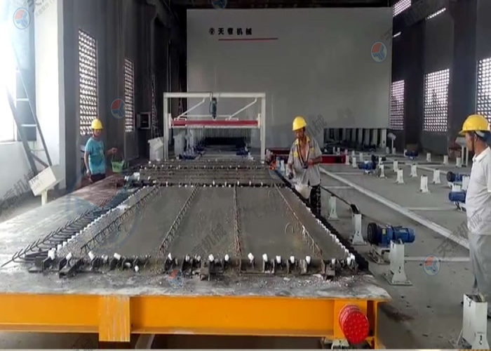 PC環(huán)形疊合板/內(nèi)墻板生產(chǎn)線的主要設(shè)備包括雙梁橋式起重機、清理機、脫模劑噴涂機、布料機、振動臺、趕平機、拉毛裝置、預(yù)養(yǎng)窯、抹光機、碼垛車、養(yǎng)護(hù)窯、翻轉(zhuǎn)機、擺渡車、支撐滾輪、驅(qū)動輪、模臺和成品運輸車等。